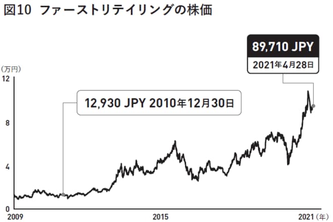 私が10年前に住んでいた会社の寮の隣がユニクロの店舗だったので、そこをよく利用していました。そこで服だけではなく株も買っていたとしましょう。2010年末時点の株価が約1万3000円で、それが2020年末時点では約9万円にも膨らんでいたのです。これだけあれば、ユニクロの服が何着も買えてしまいますね。1株でも買っていれば、7万7000円も儲かっていたことになります。