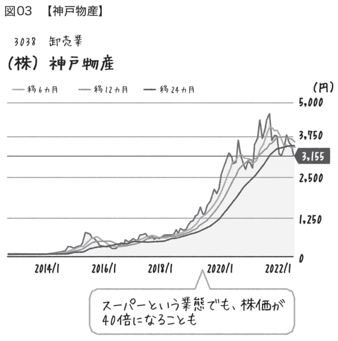 業務スーパーを運営しているのは「神戸物産」という会社です。神戸物産の株価は、この10年で約40倍になっています。私が大学生だった約15年前には、近くにあった業務スーパーによく行っていましたから、10年前に10万円でも株を買っていれば、今頃それが400万円に化けていたというわけです。これこそ「お得」な買い物ですよね。