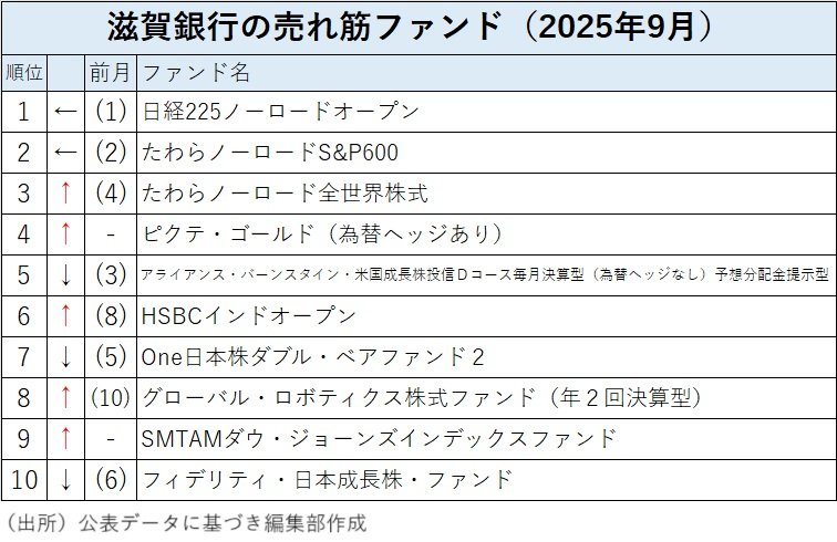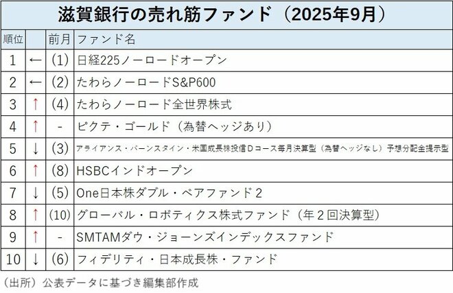 滋賀銀行の投信売れ筋ランキング(販売件数)の2025年9月のトップ2は前月と同様に「日経225ノーロードオープン」と「たわらノーロードS&P500」だった。5月以来5カ月連続で変わらずトップ2にランクされている。第3位には前月第4位だった「たわらノーロード全世界株式」が上がり、第4位にはトップ10圏外から「ピクテ・ゴールド(為替ヘッジあり)」がジャンプアップした。また、第6位に前月第8位だった「HSBCインドオープン」が、第8位には前月第10位から「グローバル・ロボティクス株式ファンド(年2回決算型)」が浮上している。
