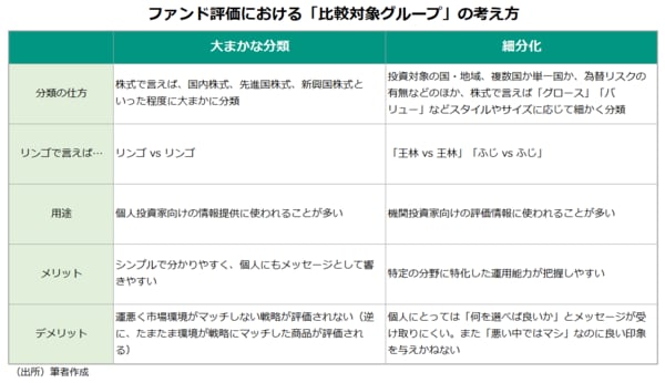 選考に用いる指標は違うとはいえ、リスクとリターンの両方を考慮するという哲学は共通している。ただ、どのような集団で比較して選んでいるかはアワードによって大きく異なる。ファンド評価の基本は「リンゴはリンゴと比べる」(同じようなもの同士で比べる)である。しかし、どんな品種であっても、リンゴであれば同じものとして比べるのか、「王林は王林」「ふじはふじ」で比べるのかでは意味合いが異なる。簡単に言えば、R&Iとリッパーのカテゴリーは細分化されており(「王林は王林」「ふじはふじ」のイメージ)、MSはざっくりとしている(どんな品種でもリンゴであればリンゴのイメージ)。