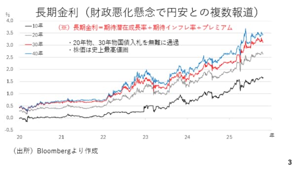 では、長期金利はなぜ上昇しているのか。長期金利の構成要素は期待潜在成長率と期待インフレ率およびプレミアムです。この内、プレミアムが拡大して長期金利が上昇することを悪い金利上昇と呼びます(スライド3)。