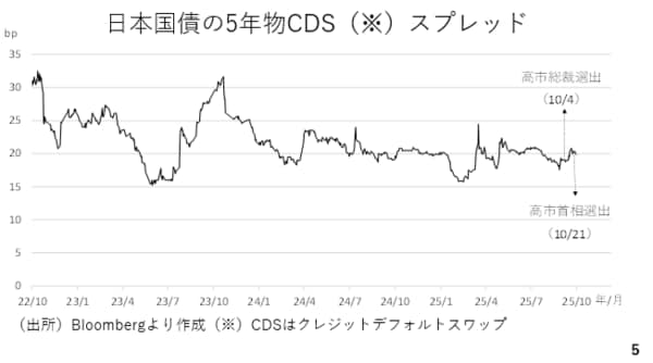 一方、政府の財政に対する懸念を表すクレジットデフォルトスワップ市場のスプレッドは横ばい圏で推移しています。やはり、悪い金利上昇とは言えない状況です(スライド5)。