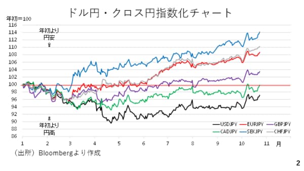 円相場を振り返っておきましょう。150円台半ばで始まった今週のドル円は153円台を回復しました。ドル円に限らず、今週は円が全面安となりました。スイスフラン円が史上最高値を更新したほかユーロ円も史上最高値付近まで上昇しました。スウェーデンクローナ円やポンド円も年初来高値を更新し、カナダが円が年初の水準を回復しました。ドル円も年初の水準まであと3%まで迫っています(スライド2)。