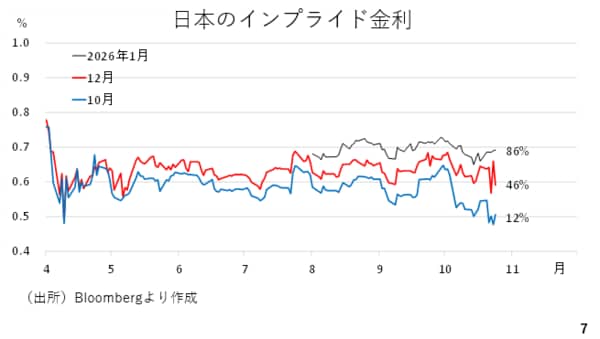 ではなぜ円安が進んでいるのでしょうか。その一因は日銀の利上げ観測の後退でしょう。来週の日銀金融政策決定会合における利上げの織り込み度合いは1割程度まで低下しました。現在の円安の根底にあるのは、日本のインフレの定着と実質金利の低下を見越したものと考えられます。それが株式相場の上昇、すなわちリスク選好の円売りや市場の一部で残っている円ロングの解消に伴う円売りなどと相まって、強力な円安圧力になっていると考えられます(スライド7)。