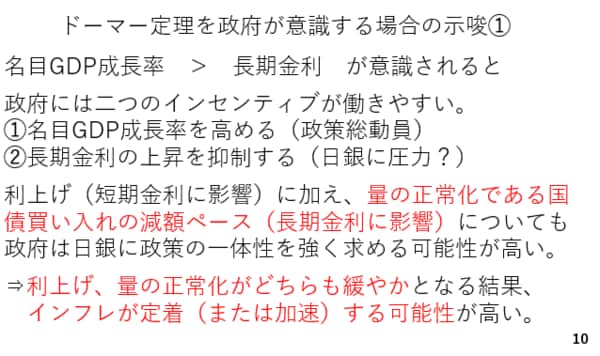 政府がドーマー定理を意識した場合、二つのインセンティブが働くと考えられます。まずは政策の総動員による名目GDPの拡大です。加えて、長期金利の上昇を抑制するインセンティブも働くと考えられます。従って、日銀の利上げに加え、長期金利の上昇につながる量の正常化についても、政府は日銀に対して政策の一体性を強く求めて行く可能性が高いと考えられます(スライド10)。