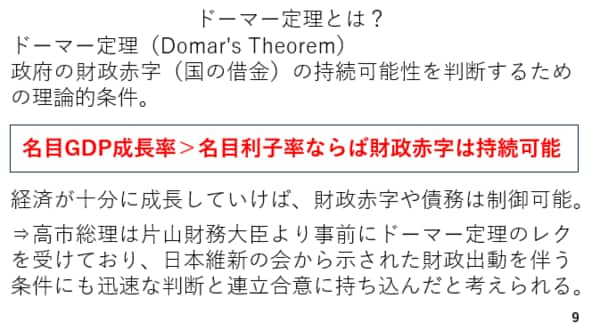 また、10月9日に経済番組に出演した高市首相も、ドーマー定理という名前こそ出しませんでしたが、やはり金利を上回る名目成長率を維持する重要性に言及しています(スライド8)。