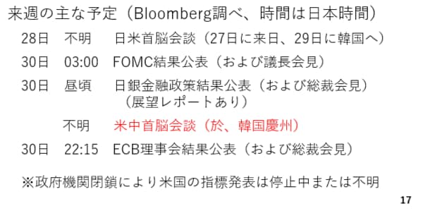 では来週の予定です。アメリカの政府機関閉鎖が続いており、経済指標の発表は引き続き未定です。一方、来週は日米や米中首脳会談に加え、中銀ウィークです。