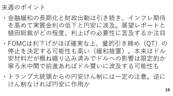総じて見て来週も155円程度まで想定しておく必要がある上、ドル安円高が進んだ場合も150円割れは押し目買いの水準として意識されそうです。(スライド18)
