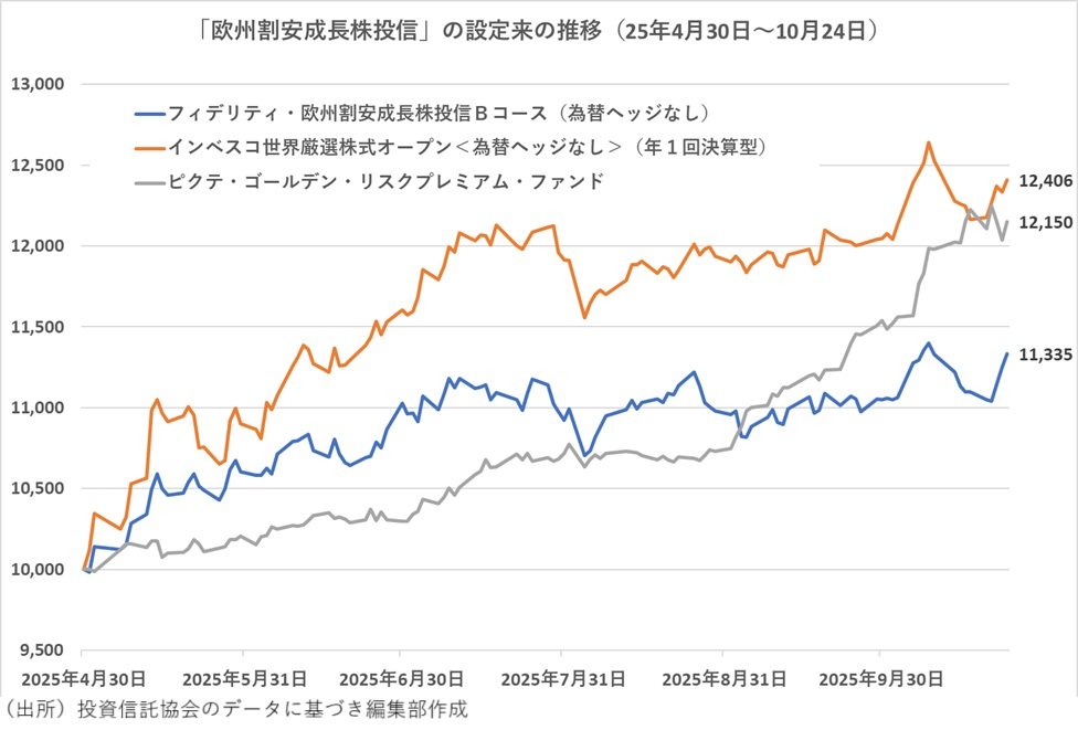 静銀ティーエム証券の売れ筋トップ10にランクインした「フィデリティ・欧州割安成長株投信 Bコース(為替ヘッジなし)」は、人気の高いファンドである「フィデリティ・世界割安成長株投信」(愛称:テンバガー・ハンター)の欧州版ともいえる、投資先を欧州地域に限定したファンドだ。投資対象を日本に限定した「フィデリティ・日本割安成長株投信」(愛称:テンバガー・ハンター・ジャパン)が2024年1月19日に設定され、欧州版が2025年4月30日に設定された。