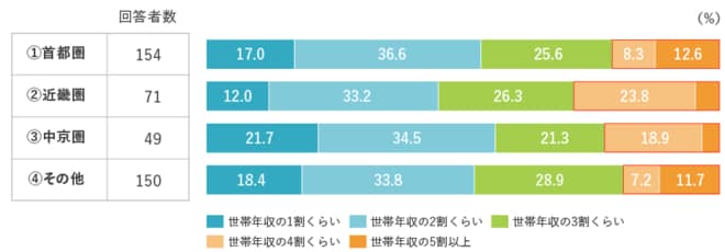 まず、住宅ローンの返済比率(年収に対する年間返済額の割合)について見てみましょう。調査結果によると、どのエリアでも「世帯年収の3割以下」に収まっている世帯が多数派ではあるものの、約5人に1人は「4割以上」の返済比率となっており、家計への負担が大きい世帯も一定数存在しています【図表1】。