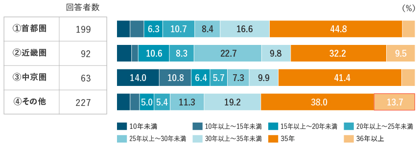 次に、返済期間についてです。全国的に「35年以上」の返済期間を設定している世帯が4割を超えており、長期化の傾向が顕著です【図表2】。特に、3大都市圏以外の地域では「36年以上」の返済期間を選択する割合が1割を超えており、都市部よりも長期ローンを選ぶ傾向が強いことがわかります。