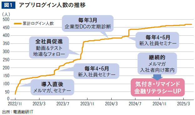 アプリの利用状況や施策の効果は、社長、人事担当、アプリ担当者のメンバーで継続的に分析・検証しています。戦略的にさまざまな工夫を積み重ねた結果、アプリ導入時はログイン率が約30%だったところ、現在は約80%まで上昇しました(図1)。