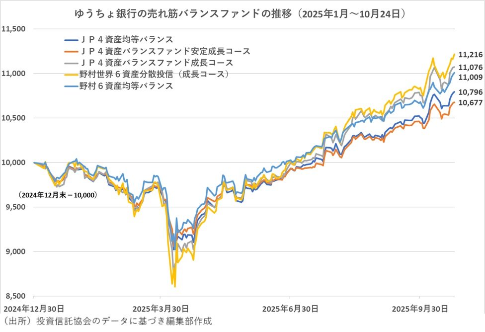 2025年1月以来のパフォーマンスを振り返ると、投資資産に均等に配分して運用するファンドでは2025年10月24日までに「野村6資産均等バランス」の方が「JP4資産均等バランス」を上回る成績を残している。2025年は4月の急落があったとはいえ、10月までをみてみると、世界的な株高が進み、リスク資産の価格上昇が目立つ期間になっている。「4資産均等」では資産の50%が債券ファンドになるが、「6資産均等」では債券への配分は33%程度になる。株式等のリスク資産をより多く保有するファンドの運用成績が良い環境だった。