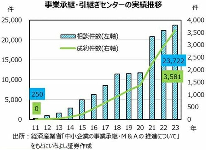 神様:M&Aなどで事業承継を支援する公的相談窓口である「事業承継・引継ぎ支援センター」の相談件数・成約件数は増加傾向にあります。これまでの事業の価値を評価し、さらに新たな価値を生み出していくためのM&Aです。中小企業経営者の高齢化を背景に、今後はこういったM&A市場が拡大していくことが期待されます。