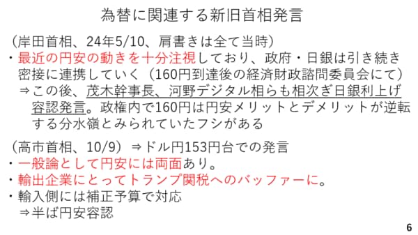 本日、片山大臣は一方的な動きであるとして、円安を牽制しましたが、高市政権は政策を総動員して名目のGDPの拡大を図る一方、金融政策については緩和的な政策を志向すると考えられます。その結果、インフレやインフレ期待の進展により、実質金利が下がり、円安が進みやすくなると考えられます。実際に日本の当局がここからの円安に対してどの程度の強い調子で牽制していくのか、注目です。(スライド6)