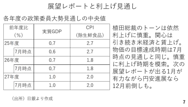 このためメインシナリオは年明け1月会合での利上げです。但し、それまでにドル円相場が160円に迫るといった円安となった場合、利上げが12月に前倒しされる可能性は認識しておく必要があります。(スライド7)
