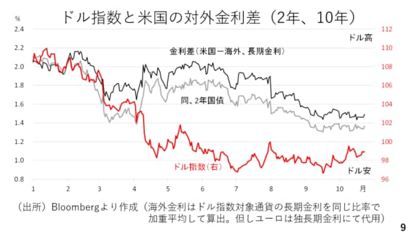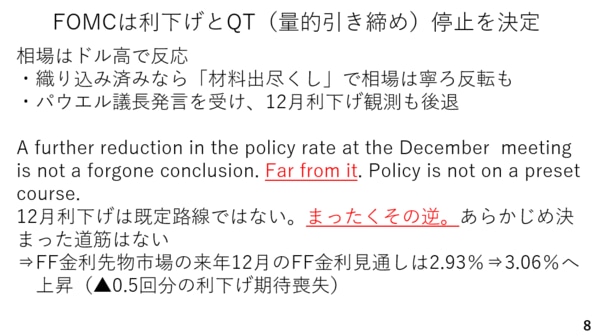 ただサプライズだったのがパウエル議長の発言です。12月の利下げを強い調子で否定したのです。9月のFOMCに示された見通しによって市場は10月に続く12月利下げも織り込んでいただけに、この発言がドル高に繋がりました。確かに経済指標の発表が遅れており、12月の利下げが既定路線とならないことは当然です。それにしても非常に強い調子で12月利下げを当然視する声をけん制したのです。(スライド8)