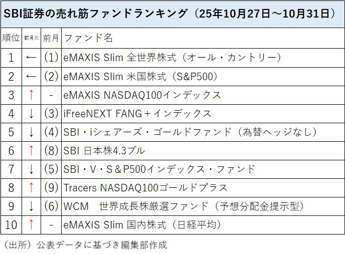 SBI証券の投信売れ筋(販売金額)ランキングの2025年10月最終週(10月27日~31日)のトップ2は前月と同様に「eMAXIS Slim 全世界株式(オール・カントリー)」(愛称:オルカン)、「eMAXIS Slim 米国株式(S&P500)」だった。第3位だった「iFreeNEXT FANG+インデックス」は第4位に後退し、第3位にはトップ10圏外から「eMAXIS NASDAQ100インデックス」が飛び込んだ。そして、第6位には前月は第8位だった「SBI 日本株4.3ブル」が上がり、トップ10圏外から「eMAXIS Slim 国内株式(日経平均)」が第10位にランクインするなど、国内株ファンドへの評価が高まった。
