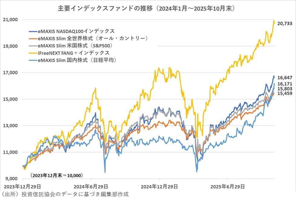 しかし、現実のパフォーマンスでは「NASDAQ100」の方が「S&P500」よりも高いリターンを残している。たとえば、2023年12月末を起点として2024年1月以降、2025年10月末までの基準価額の騰落率をみると、「eMAXIS Slim 米国株式(S&P500)」の+58.03%に対して「eMAXIS NASDAQ100インデックス」は+66.47%となっている。手数料控除後の成績で2年足らずの間で2ケタ近い差ができている。もっとも、リスク(標準偏差)は9月末時点で過去1年間が「eMAXIS Slim 米国株式(S&P500)」の17.86に対し、「eMAXIS NASDAQ100インデックス」は21.77とやや高い。投資対象は、同じように米国の大型株であるだけにパフォーマンスの差がそれほど大きく出るわけではないが、特に上昇相場において、ここ数年は「eMAXIS NASDAQ100インデックス」の優位が見て取れる。