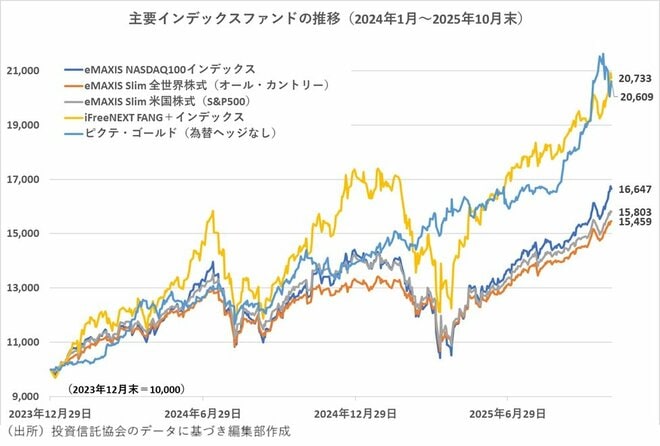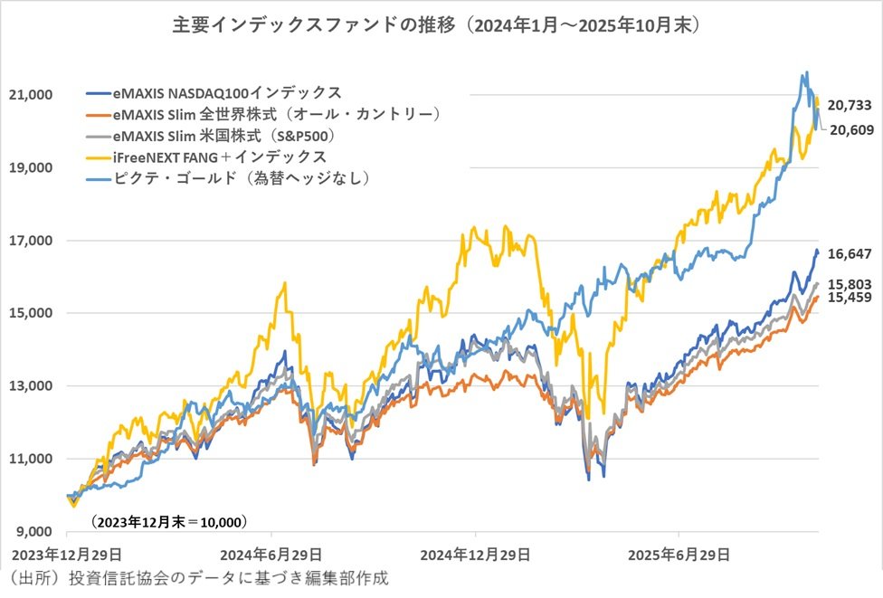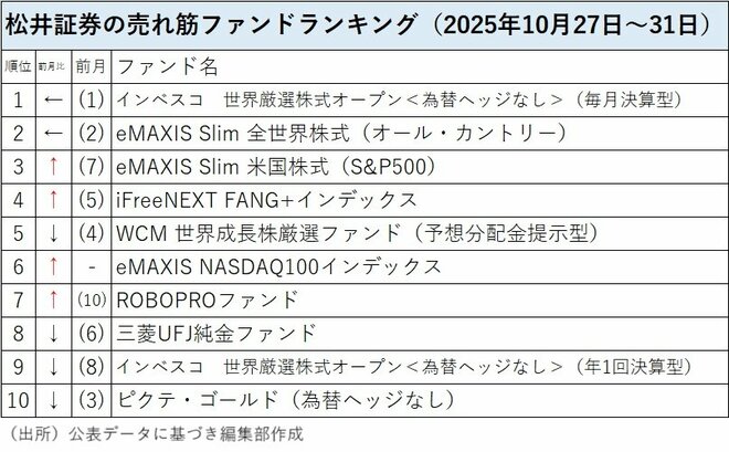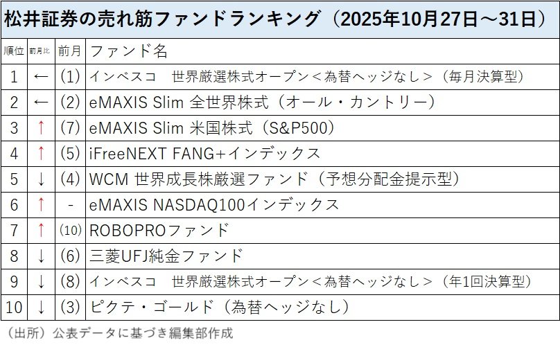 松井証券の投信売れ筋ランキングの2025年10月のトップ2は前月同様に「インベスコ 世界厳選株式オープン<為替ヘッジなし>(毎月決算型)」(愛称:世界のベスト)、「eMAXIS Slim 全世界株式(オール・カントリー)」(愛称:オルカン)だった。第3位には前月第7位から「eMAXIS Slim 米国株式(S&P500)」がジャンプアップし、第4位には前月第5位だった「iFreeNEXT FANG+インデックス」があがった。そして、第6位にはトップ10圏外から「eMAXIS NASDAQ100」がランクインするなど、米国株式関係のインデックスファンドが人気を集めた。一方、第6位だった「三菱UFJ純金ファンド」は第8位に、第3位だった「ピクテ・ゴールド(為替ヘッジなし)」は第10位に後退するなど、純金(ゴールド)関連ファンドは人気が衰えた。