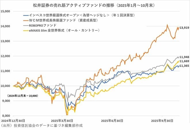 松井証券の売れ筋トップ10にランキングされる「インベスコ 世界厳選株式オープン」、「WCM 世界成長株厳選ファンド」、「ROBOPROファンド」などのアクティブファンドは、インデックスが上伸するような相場付きになると人気が衰える傾向がある。このような時には、個々のファンドのパフォーマンスを確認しておきたい。実際の動きをみると、「WCM 世界成長株厳選ファンド」と「ROBOPROファンド」は引き続き堅調な上昇を続けていることがわかる。一方、「インベスコ 世界厳選株式オープン」は、10月になってから「オルカン」を下回る成績になってしまっている。これは一時的なことなのか、それとも、同ファンドの運用方針が現在の相場とは合わなくなっているのか見極める必要がある。