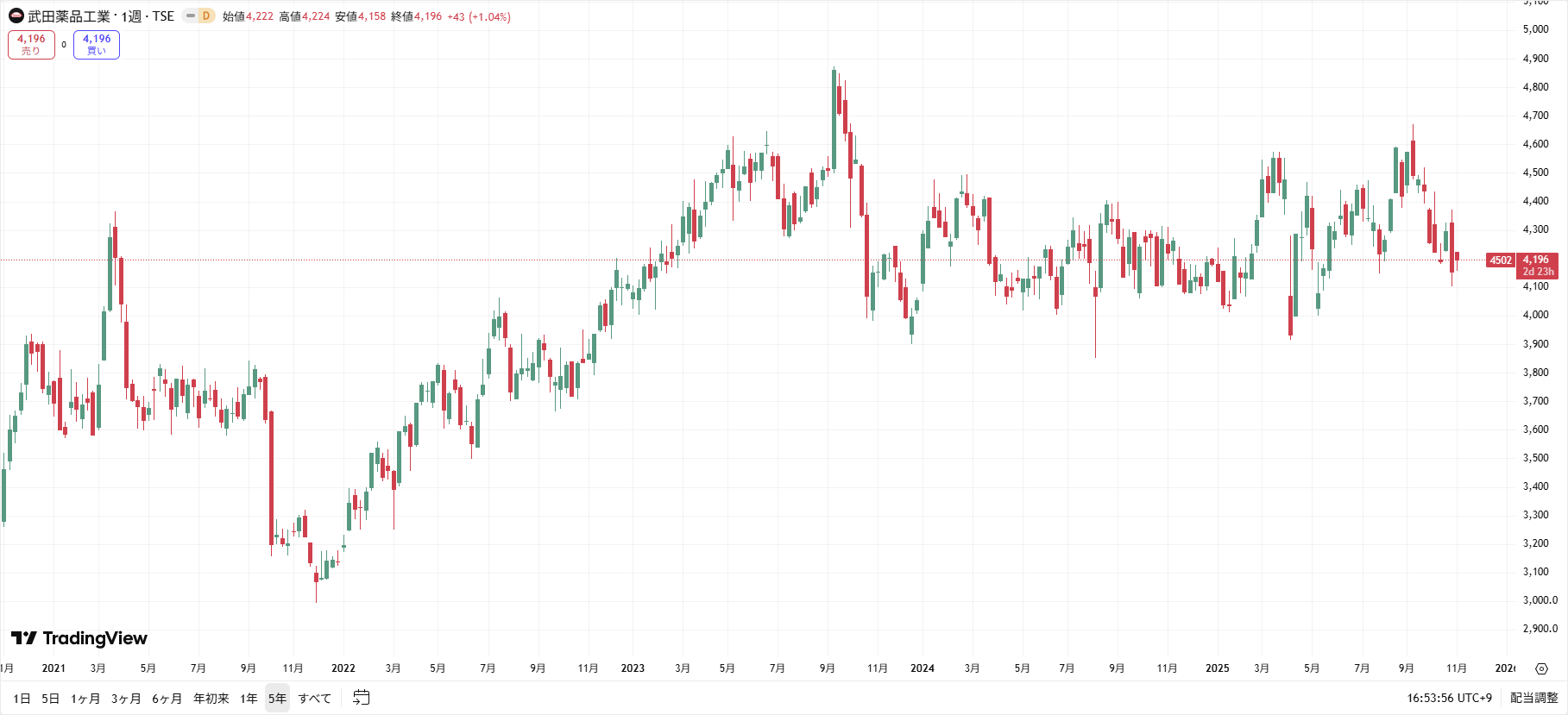 武田薬品の株価チャート(過去5年間)