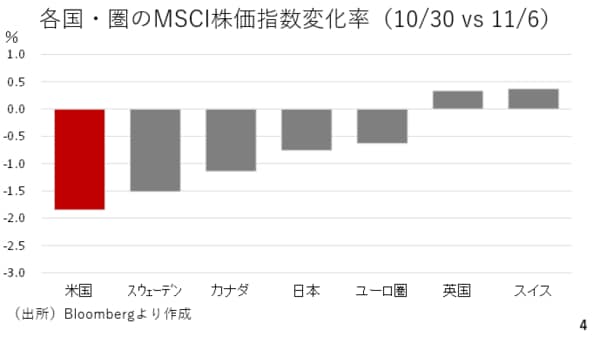 その円買いを誘ったのが株式相場の下落でした。そこで各国や地域別のMSCI株価指数の変化率を見ると米国株の下げ幅が最も大きかったことがわかります。(スライド4)