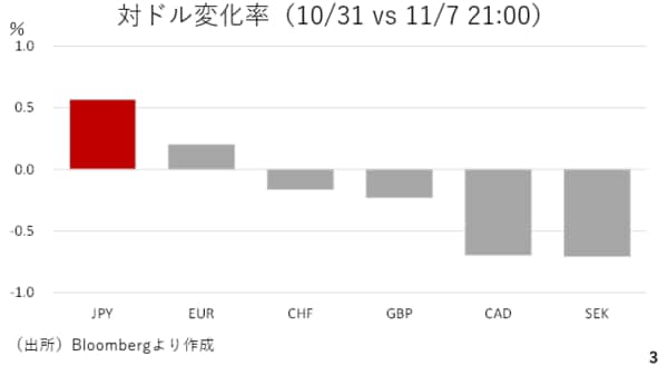この為、株価の下落によるリスク回避姿勢の高まりが円の買い戻しを誘ったと考えられます。もっとも、円独歩高とは言え対ドルで0.5%前後にとどまり、ドル円も153円割れでは底堅さを見せたとみることできます。(スライド3)