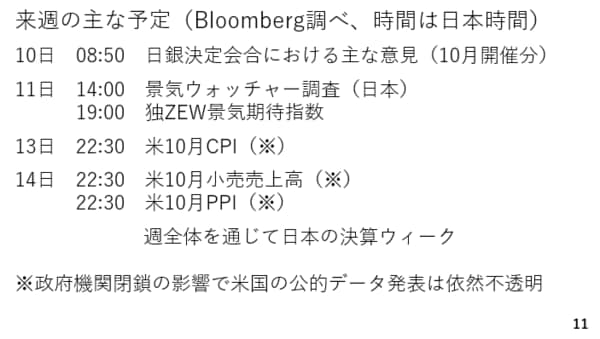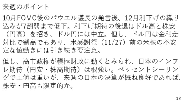来週はアメリカのCPIや小売売上高など本来であれば重要な指標が並んでいますが、依然として政府機関の閉鎖が続いており、発表されるのか不透明です。この為、来週は週を通じて日本企業の決算に注目です。日本でも一部で株価に関して割高感を指摘する声が聞かれます。業績の改善が続く場合、こうした割高感は薄れていき、総じて円安に作用すると考えられます。(スライド11)