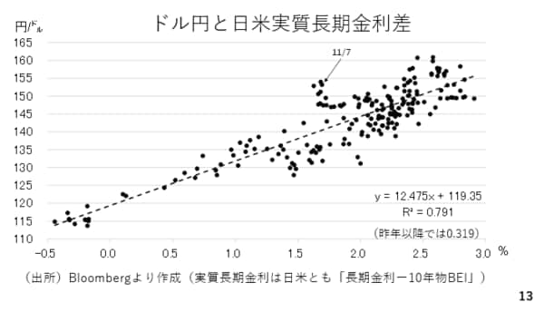 最後に2022年以降の日米実質長期金利差とドル円の関係を見ておきましょう。横軸が金利差、縦軸がドル円です。二つのことが言えます。
