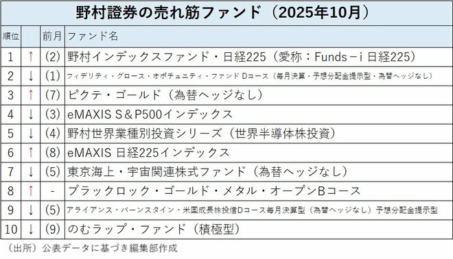 野村證券の投信売れ筋ランキング2025年10月のトップは前月第2位だった「野村インデックスファンド・日経225(愛称:Funds-i 日経225)」が上がった。前月トップの「フィデリティ・グロース・オポチュニティ・ファンドDコース(毎月決算・予想分配金提示型・為替ヘッジなし)」は第2位に後退し、第3位は前月の第7位から「ピクテ・ゴールド(為替ヘッジなし)」がジャンプアップした。そして、第6位に前月は第8位だった「eMAXIS 日経225インデックス」が上がるなど、国内株インデックスファンドの順位上昇が目立った。また、トップ10圏外から「ブラックロック・ゴールド・メタル・オープンBコース」が第8位にランクインした。