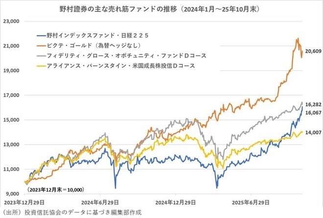 一方、第3位にジャンプアップした「ピクテ・ゴールド(為替ヘッジなし)」はトップ10へのランクインは少ないファンドだ。今回も9月に第7位にランクインし、10月に第3位にまで上がった。その前は、5月に第10位にランクインし、6月に第7位に上がったものの、7月に第10位に後退したのち、8月はトップ10から落ちていた。その前は2024年3月までさかのぼってもトップ10にランキングされてはいない。野村證券の売れ筋では、「脇役」といえる存在だった。ただ、トップ3の位置まで上がってきたことによって、今後は、「株式」や「債券」とともに「純金(ゴールド)」も主要な投資対象として位置づけられるような存在になっていくかもしれない。今後トップ10上位(第5位以内)をキープし続けられるのか注目していきたい。