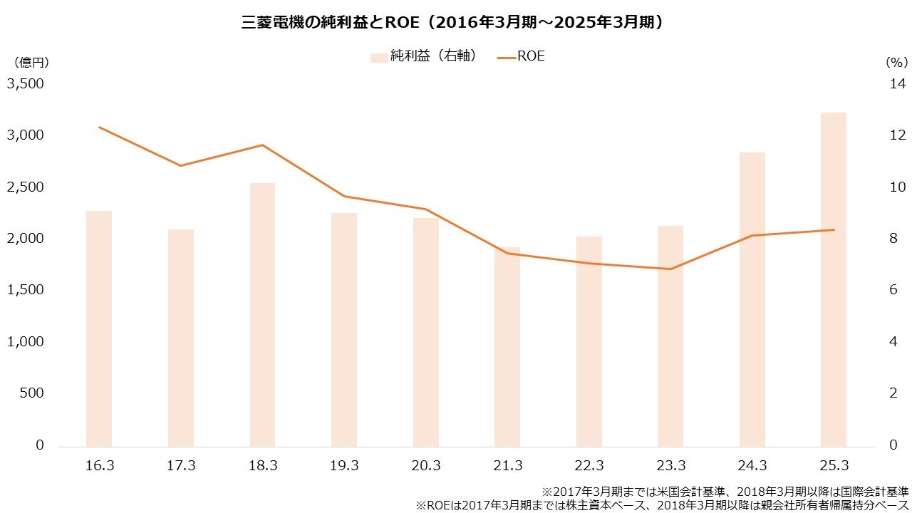 まず、三菱電機は資本効率が低いという課題を抱えています。利益は過去最高を更新しながら、ROE(自己資本利益率)は下降トレンドです。足元は目安となる8%をやや上回る水準で、競合には見劣りします。