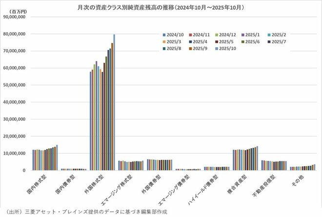 三菱アセット・ブレインズがまとめた2025年10月の公募ファンドの純資産残高は約133兆6467億円で前月比約7兆7591億円増加した。純資産残高は6カ月連続で増加し、前月に続いて史上最大を更新した。純資産残高の増加額は前月の約4兆6317億円から大幅に増額した。「外国株式型」は増加額が約5兆597億円と前月の約3兆2515億円から大幅に増加。また、「国内株式型」が約1兆1459億円(前月は約3981億円)、「複合資産型」も約5980億円(同約4101億円)、「その他」は約3974億円(同約4570億円)の増加だった。一方、「国内債券型」は約67億円の減額と前月の約100億円の減額に続いて残高が減少した。「国内債券型」は2024年9月以来14カ月連続の残高減少が続いている。
