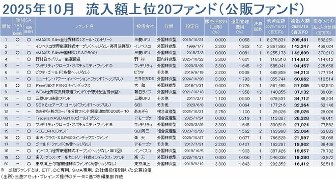流入額上位20ファンドでは、トップ3は前月同様だった。トップの「eMAXIS Slim 全世界株式(オールカントリー)」(流入額2095億円、前月2051億円)以下、「インベスコ 世界厳選株式オープン(ヘッジなし、毎月決算型)」(同1433億円、1651億円)、「eMAXIS Slim 米国株式(S&P500)」(同1427億円、1148億円)だった。第3位の「eMAXIS Slim 米国株式(S&P500)」の流入額が第2位の「インベスコ 世界厳選株式オープン(ヘッジなし、毎月決算型)」に迫っている。