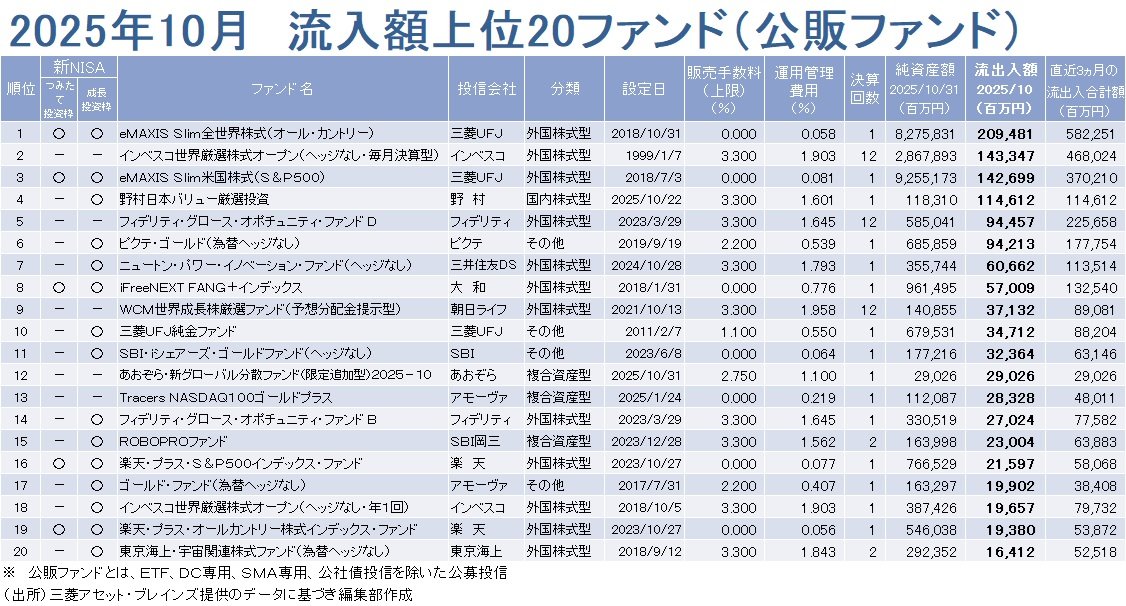 「インベスコ 世界厳選株式オープン(ヘッジなし、毎月決算型)」のパフォーマンスがやや横ばいとなり、資金流入額にも勢いが衰えていることに対し、10月は下旬に「S&P500」など米国の主要インデックスは史上最高値を更新する上伸となった。英国株や国内株など先進国の主要株価指数は軒並み史上最高値を更新する動きとなったため、全世界株式を投資対象とする「eMAXIS Slim 全世界株式(オールカントリー)」への資金流入も高水準を保っている。