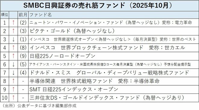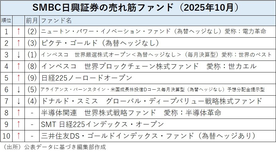 SMBC日興証券の投信売れ筋ランキングの2025年10月のトップは、前月第2位だった「ニュートン・パワー・イノベーション・ファンド(為替ヘッジなし)」が上がった。第2位にも前月第3位だった「ピクテ・ゴールド(為替ヘッジなし)」が上がっている。前月トップだった「インベスコ 世界厳選株式オープン<為替ヘッジなし>(毎月決算型)」は第3位に後退した。そして、第4位には前月第8位だった「インベスコ 世界ブロックチェーン株式ファンド」が、第5位には前月第9位だった「日経225ノーロードオープン」がそれぞれジャンプアップした。一方、前月第4位だった「ドナルド・スミス グローバルディープバリュー戦略株式ファンド」は第7位に後退し、「アライアンス・バーンスタイン・米国成長株投信Dコース毎月決算型(為替ヘッジなし)予想分配金提示型」も前月第5位から第6位に下がった。また、トップ10圏外から「半導体関連 世界株式戦略ファンド」、「SMT 日経225インデックス・オープン」、「三井住友DS・ゴールドインデックス・ファンド(為替ヘッジあり)」がランクインした。