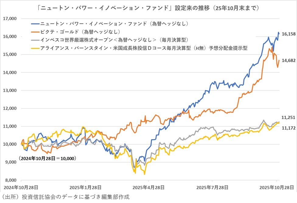 売れ筋ランキングでトップに立った「ニュートン・パワー・イノベーション・ファンド(為替ヘッジなし)」が、今後の人気株として定着するかどうかはわからない。同ファンドは2024年10月に新規設定されたばかりで、運用期間が1年ほどしかないため、中長期を見通すことがむずかしい。ただ、過去1年のパフォーマンスは株式ファンドよりも大きなリターンを稼いできた「ピクテ・ゴールド(為替ヘッジなし)」を上回る成績だった。今後が楽しみなファンドだ。