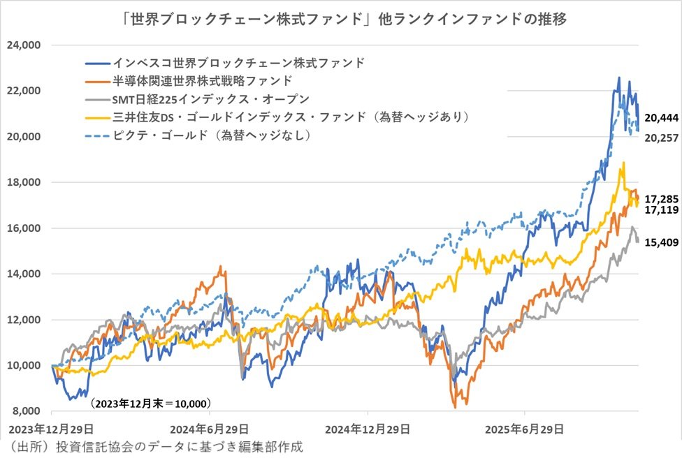 10月に売れ筋ランキングで第4位にジャンプアップした「インベスコ 世界ブロックチェーン株式ファンド」は、ブロックチェーン技術を用いた決済システムやサービス等のブロックチェーン・ビジネス関連企業の株式に投資するファンドだ。同ファンドのパフォーマンスについて2023年12月末を起点として他のファンドと比較すると2025年11月7日時点で「ピクテ・ゴールド(為替ヘッジなし)」に匹敵するパフォーマンスになっている。ブロックチェーン技術はこれからの決済インフラとして期待されている。9月の上昇要因は、月報によると、「AIクラウドサービスやAIデータセンターへの活発な投資需要を受けて、高性能コンピューティングデータセンター開発の事業ポートフォリオを持つアイレン(豪)やサイファーマイニング(米)などの暗号資産マイニング企業の株価が大きく上昇」となっており、ブロックチェーン技術が直接的な要因にはなっていないようだが、今後の展開を見守りたい。