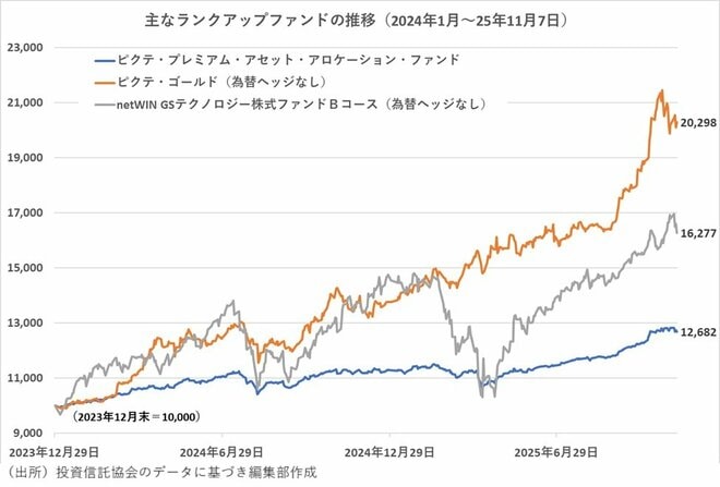 そして、第9位から第7位にランクアップした「netWIN GSテクノロジー株式ファンドBコース(為替ヘッジなし)」は代表的な成長株ファンドだ。10月末時点での過去1年間のトータルリターンは28.46%と「S&P500」インデックスファンドなどの水準を超えている。このパフォーマンスの強さが、株式ファンドの中でも人気化しやすい理由の1つだろう。設定は1999年11月とすでに25年以上の歴史があるファンドだ。9月末時点の組み入れ銘柄はトップに「エヌビディア」、以下は「アルファベット」、「アマゾン」、「マイクロソフト」、「メタ・プラットフォームズ」など、いわゆる「マグニフィセント・セブン(M7)」といわれたハイテク大型株を継続保有している。「M7」は決算等の情報に株価が大きく変動するようになっている。今後、人気が継続するか注目される。