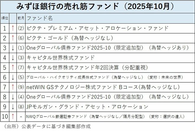 みずほ銀行の投信売れ筋ランキングの2025年10月のトップは前月の第2位から「ピクテ・プレミアム・アセット・アロケーション・ファンド」が上がった。第2位には前月第6位だった「ピクテ・ゴールド(為替ヘッジなし)」がジャンプアップし、前月トップだった「Oneグローバル債券ファンド2025-10(限定追加型)(為替ヘッジあり)」は第3位に後退した。また、前月第3位だった「キャピタル世界株式ファンド」は第4位に落ち、前月第4位だった「Oneグローバル債券ファンド2025-10(限定追加型)(為替ヘッジなし)」は第8位になった。一方、前月第7位だった「キャピタル世界株式ファンド年2回決算(分配重視)」は第5位に上がり、前月第9位だった「netWIN GSテクノロジー株式ファンドBコース(為替ヘッジなし)」は第7位に上がった。また、トップ10圏外から「NWQグローバル厳選証券ファンド(為替ヘッジなし/隔月分配型)」が第10位にランクインした。