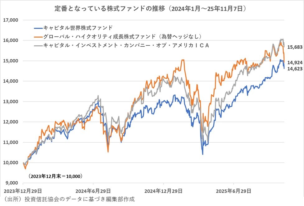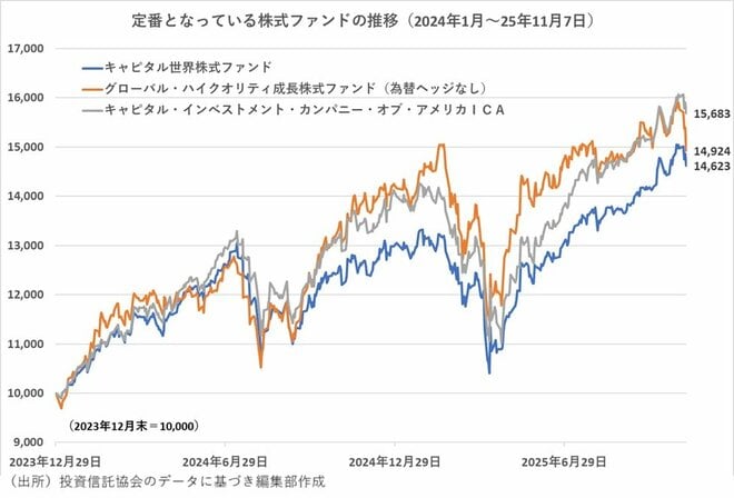 みずほ銀行の売れ筋トップ10の常連といえる「キャピタル世界株式ファンド」、「グローバル・ハイクオリティ成長株式ファンド(為替ヘッジなし)(愛称:未来の世界)」、「キャピタル・インベストメント・カンパニー・オブ・アメリカ ICA」などのファンドは、2025年になってパフォーマンスの面でもう一つの成績になっているため、トップ10の位置も定まらない。「キャピタル・インベストメント・カンパニー・オブ・アメリカ ICA」は、トップ10に出たり入ったりを繰り返している。この3ファンドの10月末時点での過去1年間のリターンは、「キャピタル世界株式ファンド」が19.69%と「S&P500」インデックスファンドと同程度、「未来の世界」は16.92%、「ICA」は20.82%という水準だ。