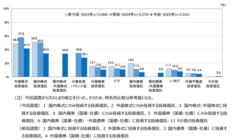 なお前回調査時から項目を変更し、より投資信託の種類を細分化しているため比較には注意が必要だ。具体的には、今回から「国内株式・外国株式に投資する投資信託」を新設した。グラフでは外国株式投資信託と国内株式投資信託が前年比で減ったように見えるが、その一部がこの新設の国内株式・外国株式に投資する投資信託に移行しているためだ。