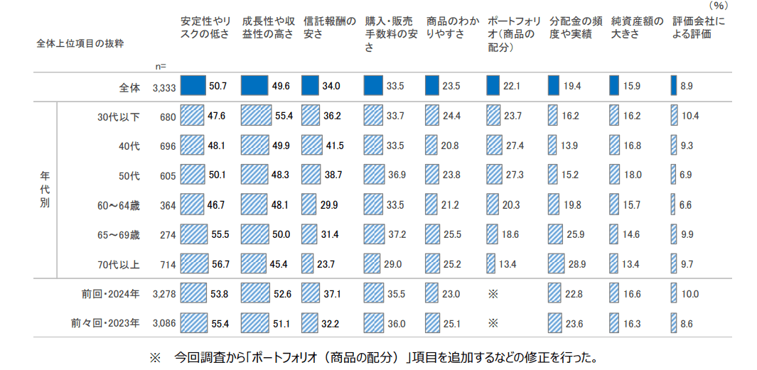 投資信託を購入するとき、何を重視するのか。「個人投資家の証券投資に関する意識調査報告書」(日本証券業協会、2025年9月公表)の調査結果から投資信託を持つ3300人の回答を参考に考えていきたい。