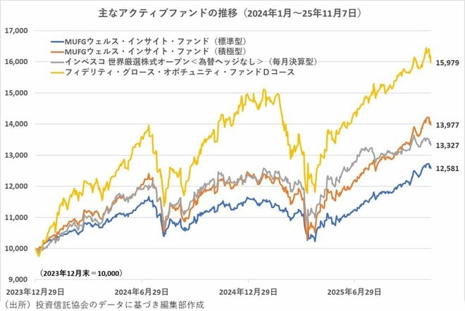 一方、アクティブファンドの中では、ランキングで第4位になっている「フィデリティ・グロース・オポチュニティ・ファンド Dコース」がずぬけて高い運用成績になっている。2023年12月末を起点として2025年11月7日時点の上昇率は59.79%と、「eMAXIS Slim 米国株式(S&P500)」などの54%台を上回る成績だ。ランキングの順位では第2位の「MUFGウェルス・インサイト(標準型)」や第3位の「インベスコ 世界厳選株式オープン<為替ヘッジなし>」に後れを取っているが、現在のパフォーマンスが維持されれば、いずれ評価も変わってくるものと考えられる。