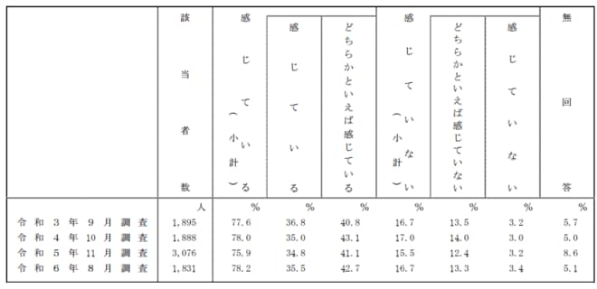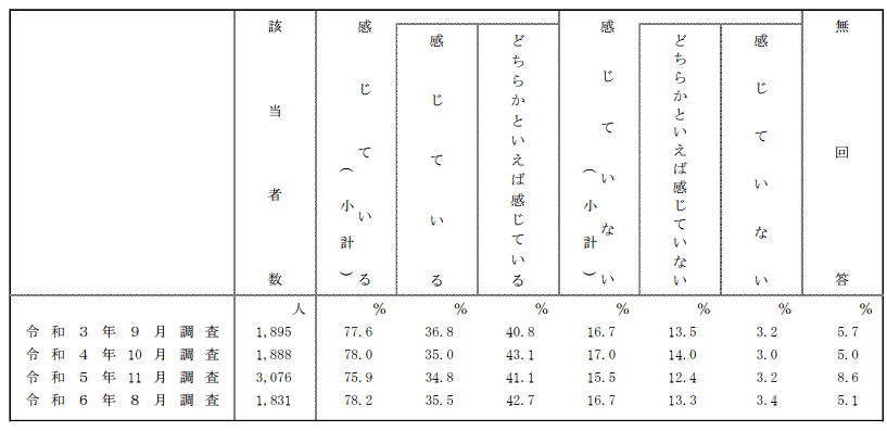 日常生活での悩みや不安について、2021年から2025年までの5年間でなにか変化はあったのだろうか。調査結果によれば、悩みや不安を「感じている」と回答した人の割合はおおむね77~78%台を推移している。