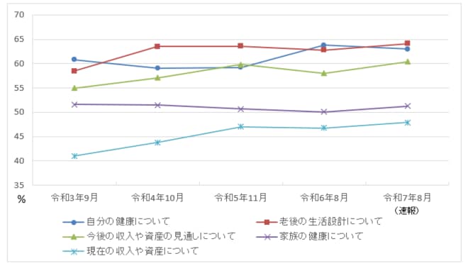 2021年から2025年まで5年間の悩みや不安の推移を見てみた。調査結果によると、最も増加が著しいのは「現在の収入や資産について」(41.0%から47.9%、6.9ポイント増)。次いで「老後の生活設計について」(58.5%から64.1%、5.6ポイント増)、「今後の収入や資産の見通しについて」(55.0%から60.4%、5.4ポイント増)と続く。お金に関わる悩みや不安が増加率で上位を占めている。