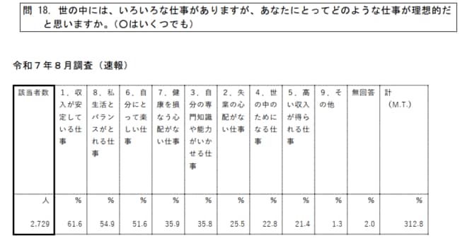 多くの人が考える理想の仕事像とはどんなものだろうか。調査結果によれば、最も回答率が高いのは「収入が安定している仕事」で61.6%。近年は雇用期間が限定された非正規雇用が増加。労働力に占める割合は2024年で36.8%と約3人に1人が非正規雇用だ。 そうした雇用の不安定化の背景もあり、安定した収入を希望する人は多いようだ。