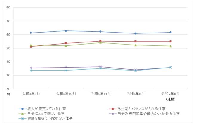 2021年から2025年までの5年間で、理想の仕事像にはどのような変化があったのか。調査結果によれば、5年前と比較して最も割合が増加したのは「私生活とバランスがとれる仕事」(51.2%から54.9%、3.7ポイント増)。次いで「健康を損なう心配がない仕事」(33.7%から35.9%、2.2ポイント増)、「高い収入が得られる仕事」(19.5%から21.4%、1.9ポイント増)と続いた。