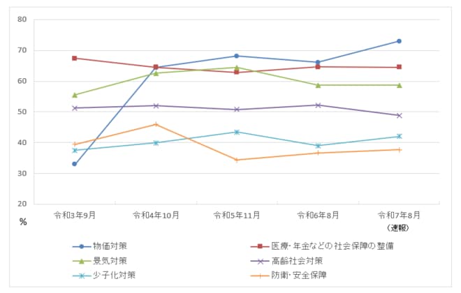 政府への要望はこの5年間でどう変化したのだろうか。調査結果によれば、2021年から2025年までの5年間で割合が最も増加したのは「物価対策」(32.9%から73.0%)。40.1ポイント増と2位以下を大きく引き離している。長年デフレだったこともあり、慣れない物価上昇への恐怖心や日常生活への影響の大きさなどもあって、対策を要望する人は多いようだ。物価上昇に関する正しい知識の普及などきめ細やかな情報提供も必要かもしれない。